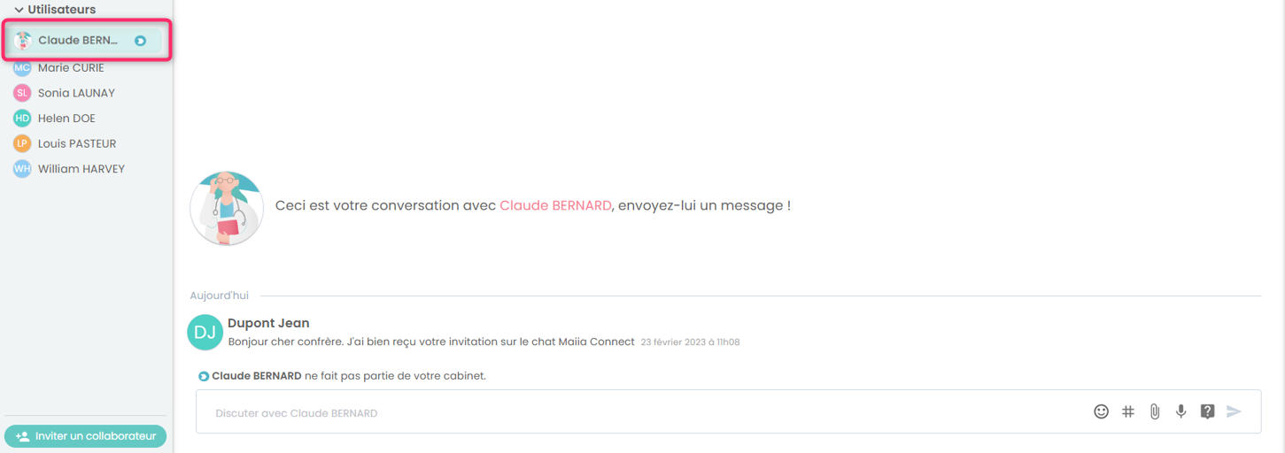 6. Le collaborateur a été ajouté parmi vos utilisateurs, vous pouvez, dès à présent, débuter la conversation :