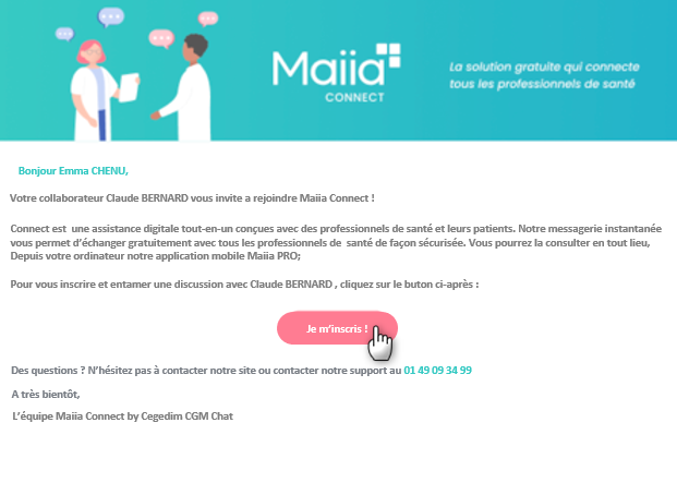 Lorsque vous ne bénéficier pas de notre solution gratuite Maiia Connect et qu'un professionnel de santé souhaite échanger avec vous via le Chat, vous recevrez un mail de sa part vous invitant à vous inscrire au Chat Maiia Connect.