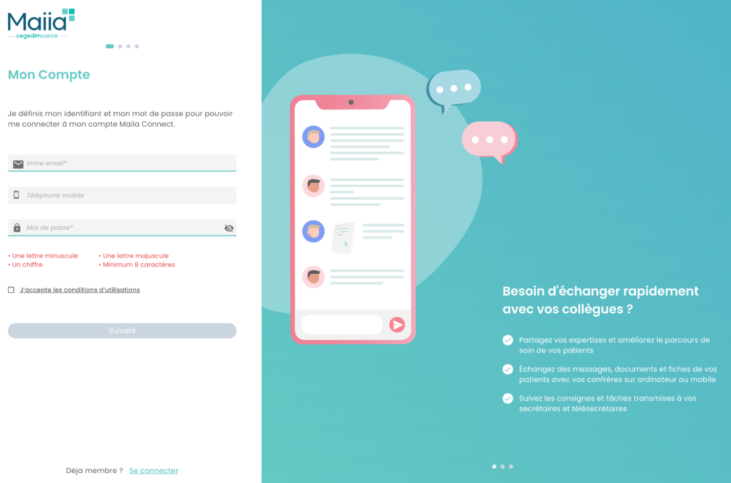 Le Chat Maiia Connect vous permet d'échanger, sur un espace Cegedim sécurisé HDS (Hébergeur de Données de Santé), avec des spécialistes et d'autres professionnels de santé, médecins, paramédicaux ou pharmaciens, quel que soit leur lieu d'exercice en France.