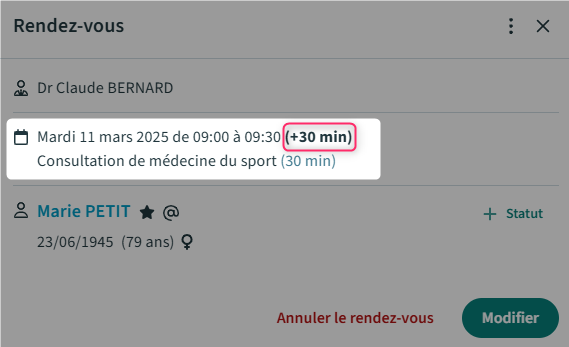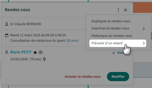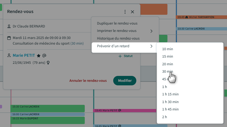 5. Si vous cliquez de nouveau sur le RDV, vous verrez la durée du retard annoncée au patient
