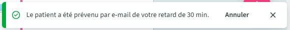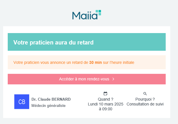 Maiia vous permet d'avertir le patient si vous êtes en retard au rendez-vous.