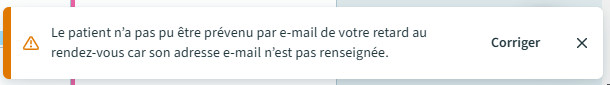 Attention : Un patient sans email ne pourra pas être averti. Pensez à bien renseigner sa fiche patient. Le bandeau suivant apparaitra dans ce cas