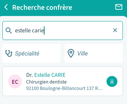 5. Il est possible de rechercher un collaborateur en insérant son nom, sa spécialité ou son lieu d'exercice :