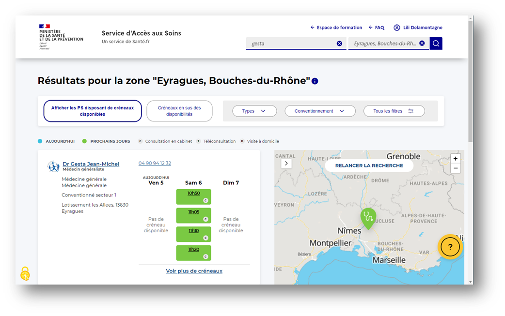 1. Je suis connecté sur la plateforme SAS, et j’effectue une recherche d’offre de soins à proximité de l’adresse du patient. Le résultat de recherche me remonte la fiche d’un médecin généraliste avec des disponibilités sur les trois prochains jours.