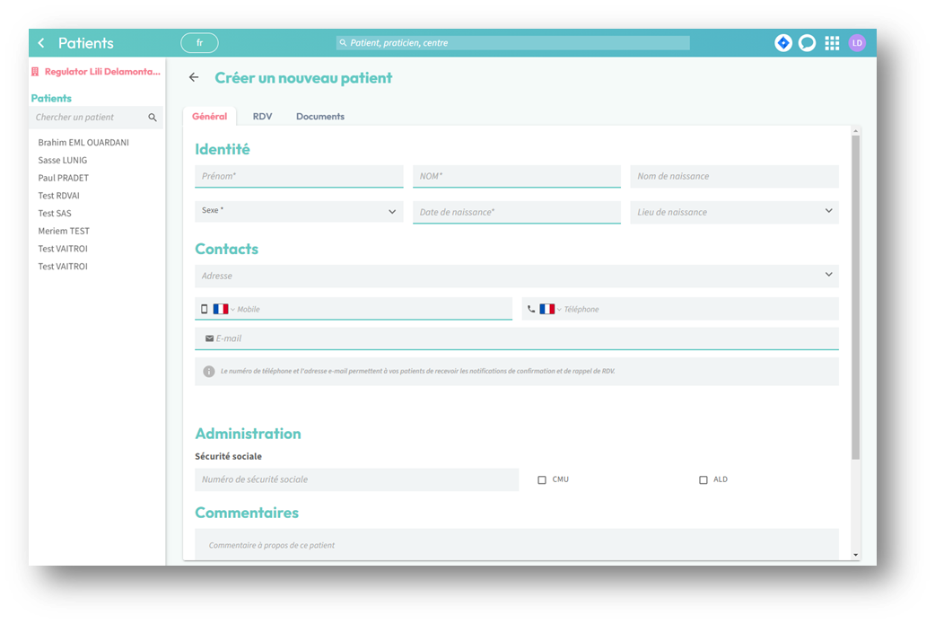 Je suis invité à créer un nouveau patient en renseignant sa fiche administrative.