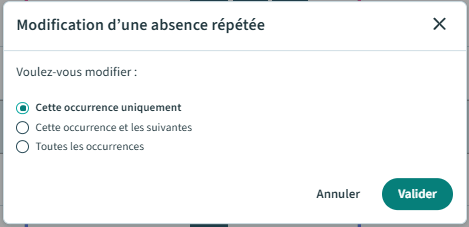 Après avoir suivi le processus de modification d’une absence et cliqué sur « Valider », une nouvelle fenêtre apparaît lorsqu’il s’agit d’une absence récurrente.