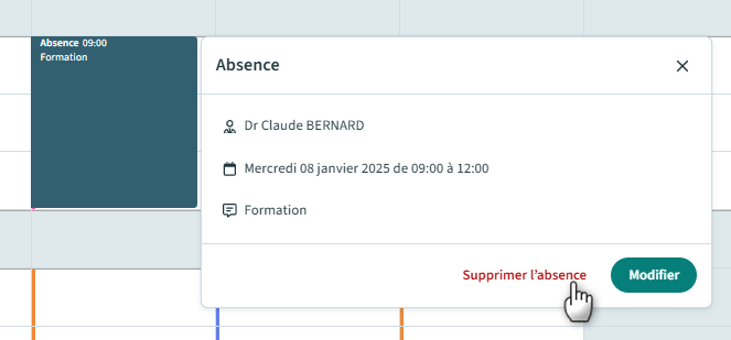 L’absence est supprimée. Attention, si vous avez annulé des rendez-vous présents sur la plage horaire au moment de la pose de l’absence, la suppression de l’absence ne les restaurera pas.