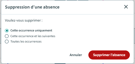 Après avoir suivi le processus de suppression d’une absence et cliqué sur « Valider », une nouvelle fenêtre apparaît lorsqu’il s’agit d’une absence récurrente.