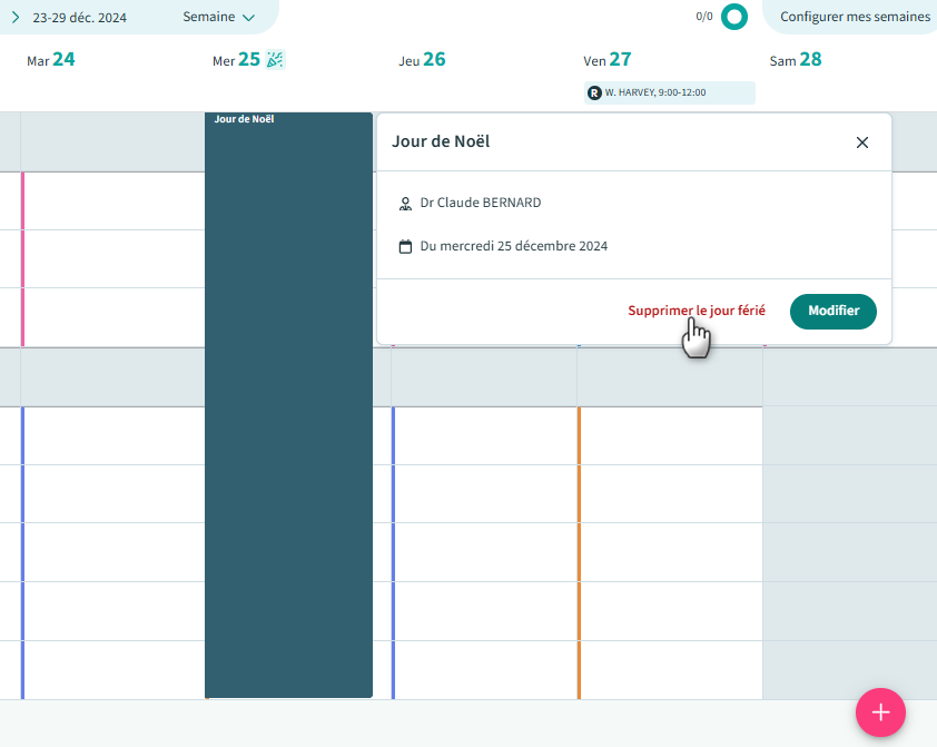 Si vous souhaitez ouvrir la prise de rendez-vous sur un jour férié, il est possible de supprimer l’absence.