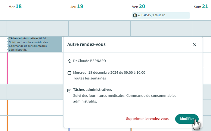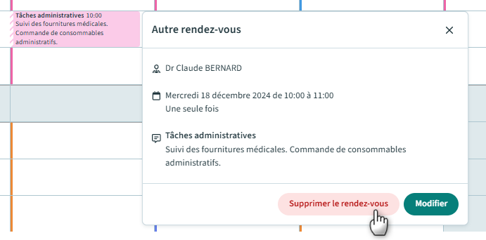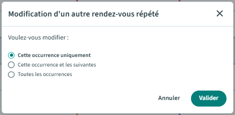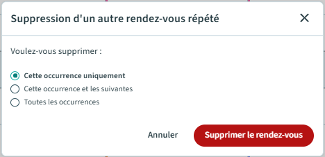 Après avoir suivi le processus de suppression d’un autre rendez-vous et cliqué sur « Valider », une nouvelle fenêtre apparaît lorsqu’il s’agit d’un autre rendez-vous récurrent.