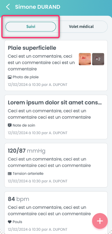 - Suivi : Cet onglet regroupe les constantes, les notes de soins et les photos de plaies.