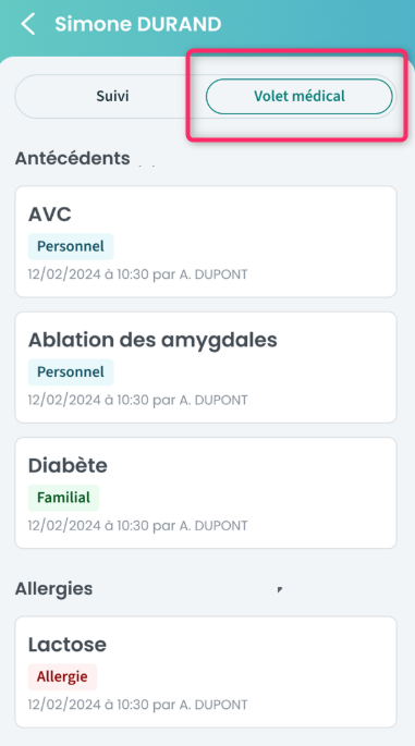 - Volet médical : Cet onglet contient les allergies et les antécédents médicaux du patient.
