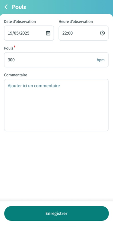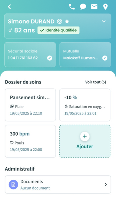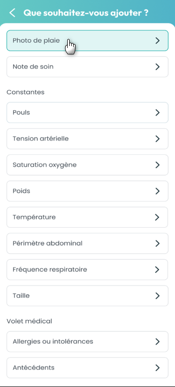 - Sur une constante ou une plaie, cela permet l’ajout d’une nouvelle mesure ou photo, facilitant ainsi la mise à jour des informations de suivi.