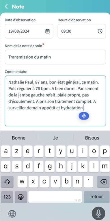 - Renseignez un Titre pour votre note de soin (par exemple, « Transmission du matin »).
