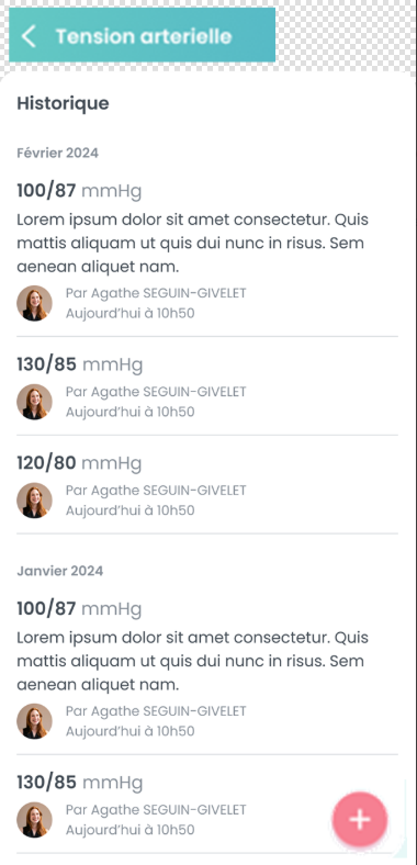Le "Dossier de soins" affiche les 3 dernières entrées sous forme de carte avec la dernière valeur saisie.