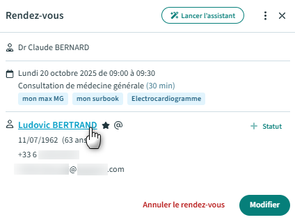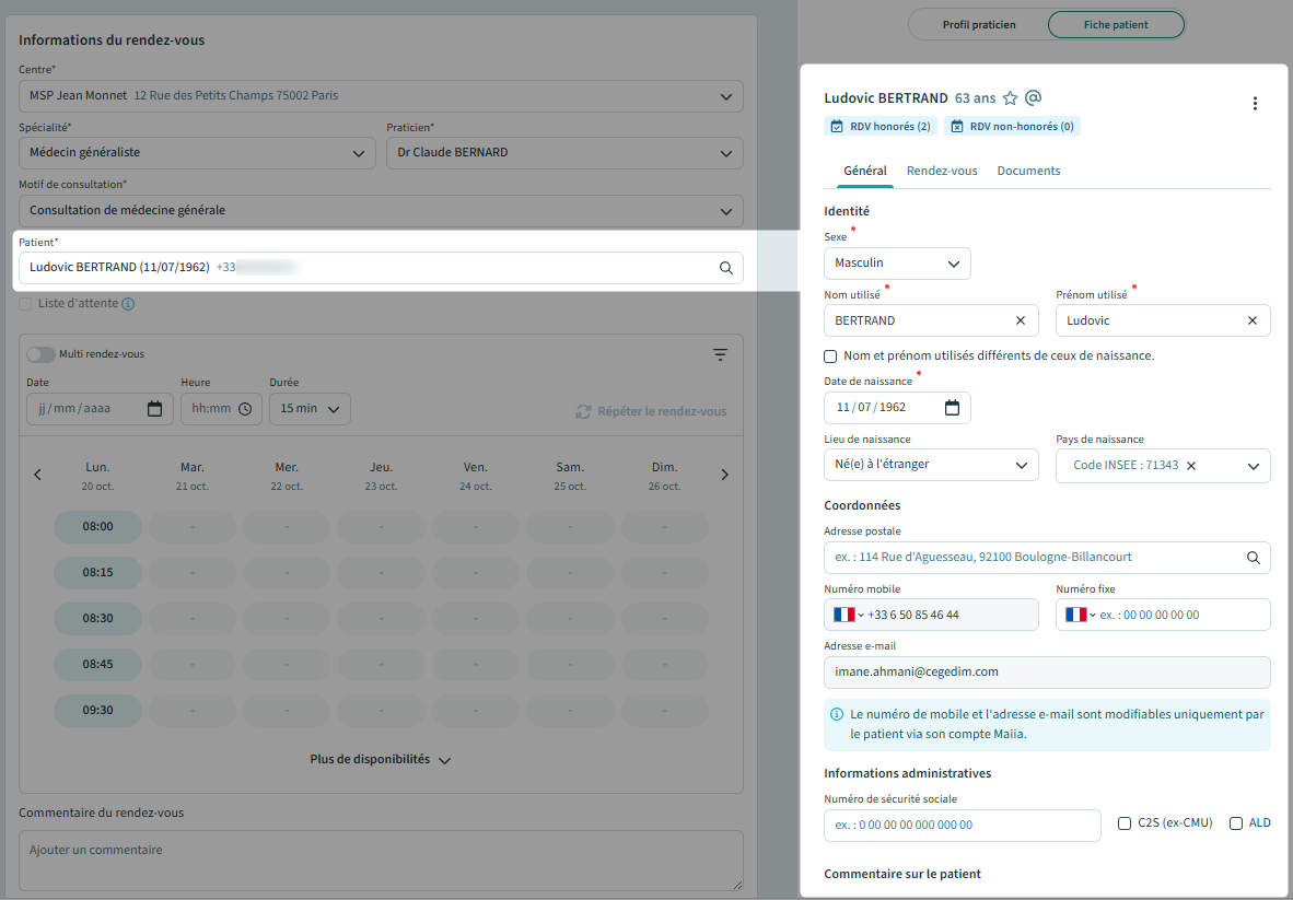 Insérez le nom du patient dans la prise de rendez-vous assistée dans la zone de gauche, une fois le patient sélectionné, sa fiche patient apparait alors à droite :