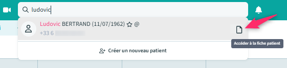 Dans la barre de recherche d'accès rapide situé en haut de l'agenda, rentrez le nom du patient que vous recherchez puis cliquez sur le symbole (icone fichier) pour accéder à sa fiche patient