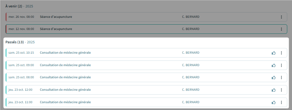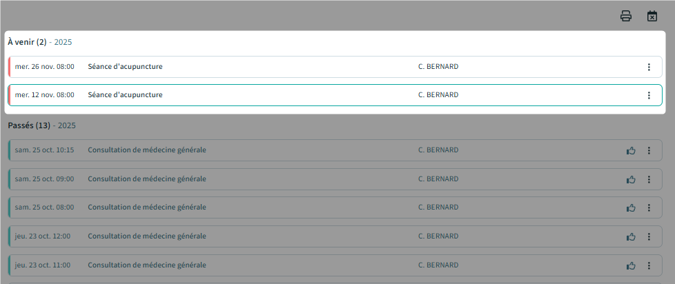 - Les rendez-vous à venir s'affichent en haut. Vous pouvez les consulter et les modifier directement si nécessaire (en cliquant sur les trois petits points en fin de ligne) :