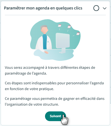 Une fois connecté à votre agenda Maiia via le mail de bienvenue, un message s'affiche lors de votre première connexion pour vous inviter à lancer la configuration guidée de votre agenda Maiia.