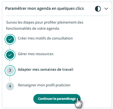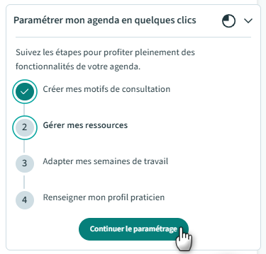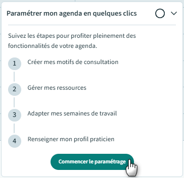Quatre étapes essentielles pour profiter des fonctionnalités de votre agenda. Cliquez sur le bouton "Commencer le paramétrage" pour débuter :