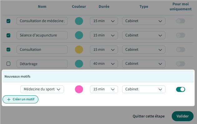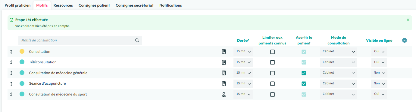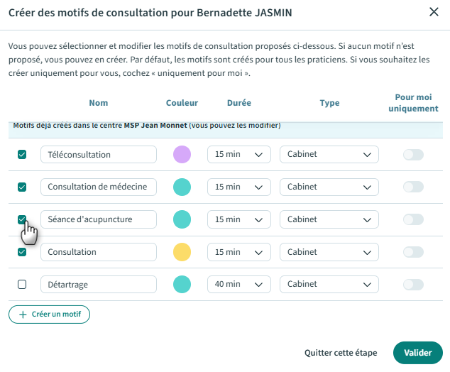 Cette étape vous présente les motifs de consultation partagés par votre centre : vous pouvez choisir ceux que vous souhaitez utiliser en cochant ou décochant les cases de gauche. Pour chaque motif, vous gardez la main sur la personnalisation (couleur, durée, type)
