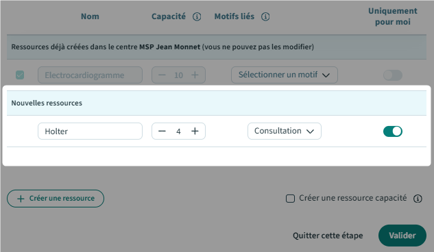 NB : Vous pouvez cocher la case "Créer une ressource capacité" si une ressource a une capacité limitée, vous pouvez définir le nombre maximum de patients pouvant être pris en charge simultanément pour un motif donné.