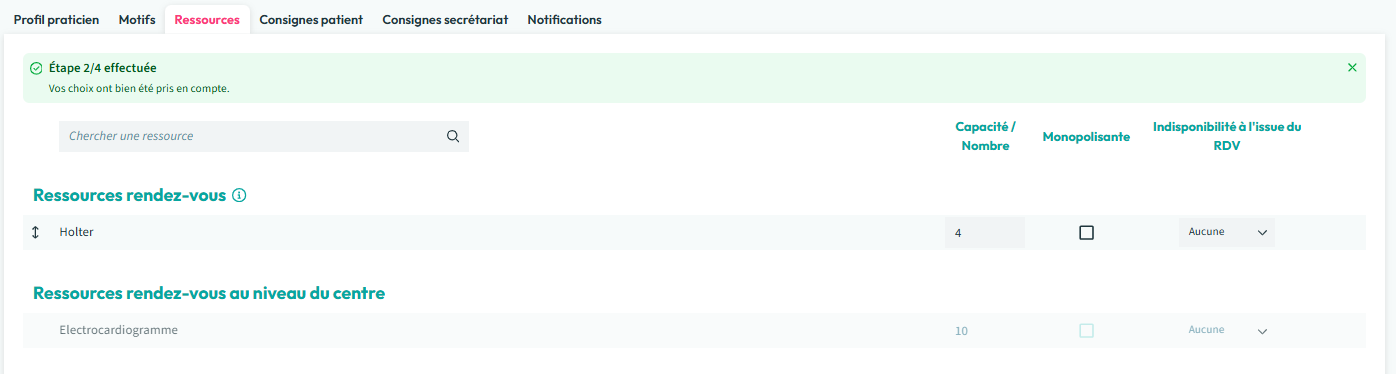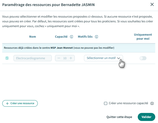 Vous visualisez les ressources déjà configurées par votre centre. Vous pouvez les sélectionner et les lier à vos motifs de consultation pour automatiser votre organisation.