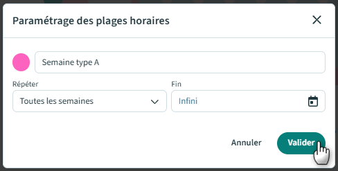 Elle vous permet de définir vos plages horaires habituelles, de choisir leurs fréquences de répétition (par exemple, toutes les semaines, ou une semaine sur deux, etc.) et de fixer une date de fin si nécessaire. C'est ici que vous posez les bases de votre emploi du temps pour automatiser l'ouverture de vos rendez-vous.