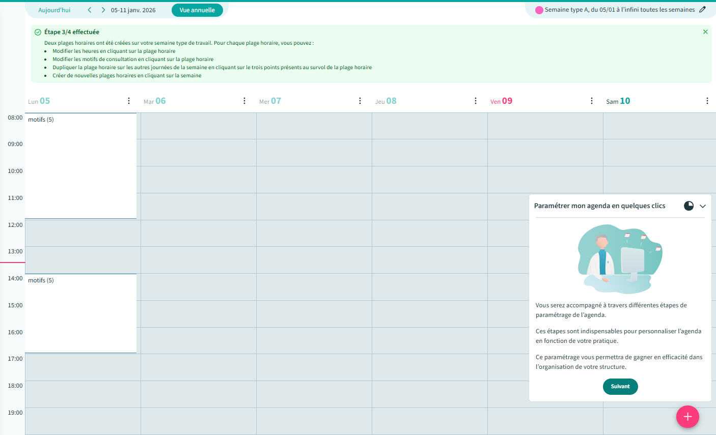 Une fois vos plages horaires initiales générées, vous disposez de plusieurs options pour compléter votre agenda : modifier les heures ou les motifs de consultation associés en cliquant directement sur une plage horaire spécifique, copier une plage horaire sur d'autres jours de la semaine...