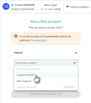 Le praticien a paramétré un motif de consultation avec deux modes de consultation, en présentiel et en téléconsultation. Comment le patient peut choisir entre ces deux types de consultations?