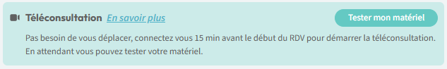 Optionnel : Pour éviter tout désagrément technique lors de la téléconsultation, le patient a la possibilité de tester son équipement (micro, caméra, connexion) avant l'heure de son rendez-vous.