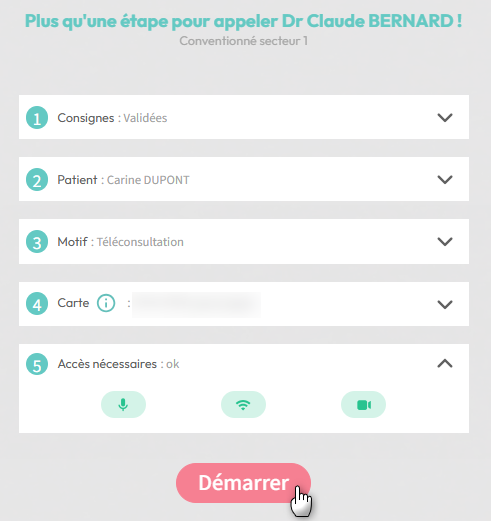 2. Comme les étapes nécessaires pour appeler le praticien sont déjà préremplies, le patient clique directement sur le bouton "Démarrer"