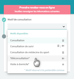 - Lorsque le patient choisit un motif avec deux modes de consultation, une étape intermédiaire s'ajoute automatiquement à la prise de rendez-vous. Le patient doit sélectionner le type de consultations qu'il souhaite. Ce choix est nécessaire pouvoir passer à l'étape suivante de la réservation.