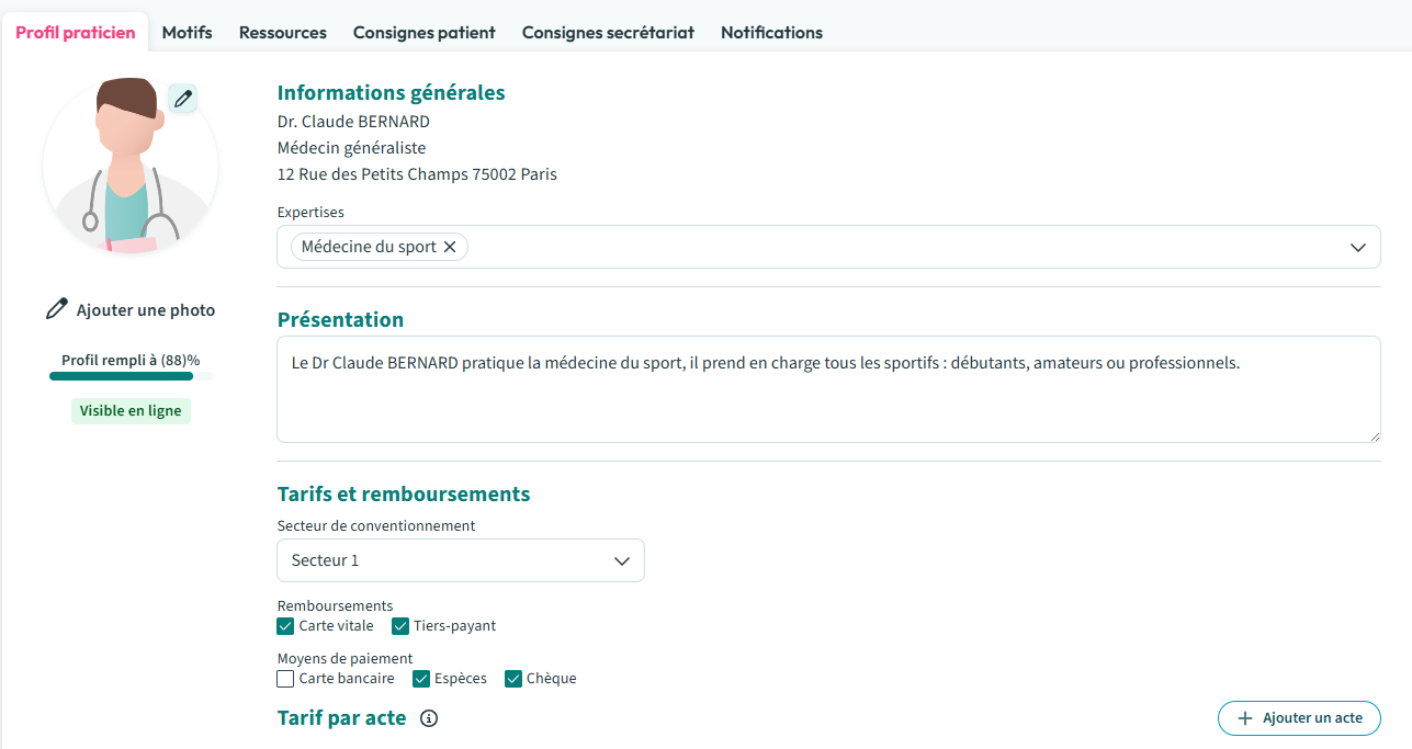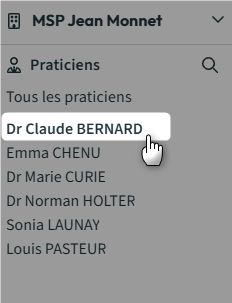 Dans cet exemple, nous avons sélectionné le praticien Claude Bernard