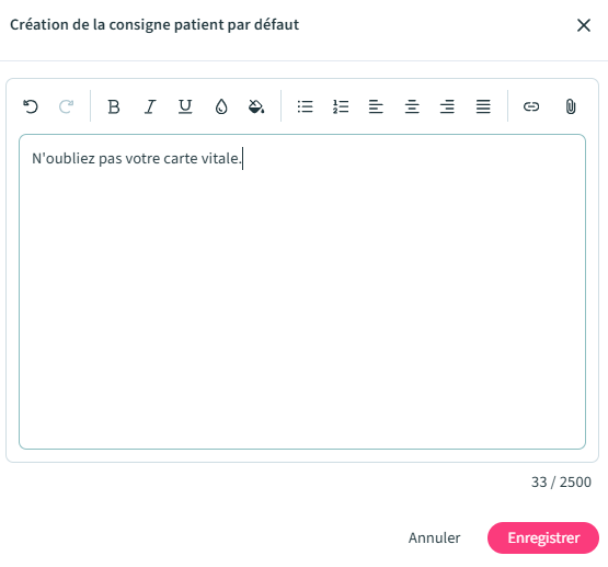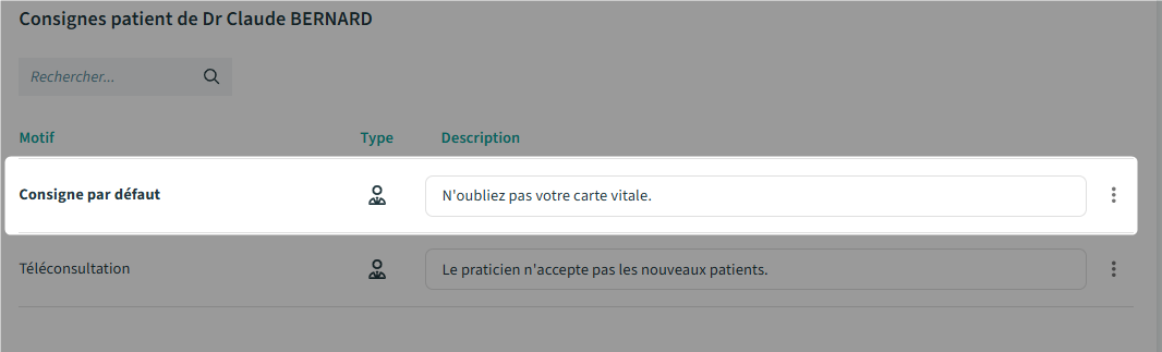 Si vous définissez la consigne par défaut pour le centre avant celle pour un praticien, celui-ci en hérite.