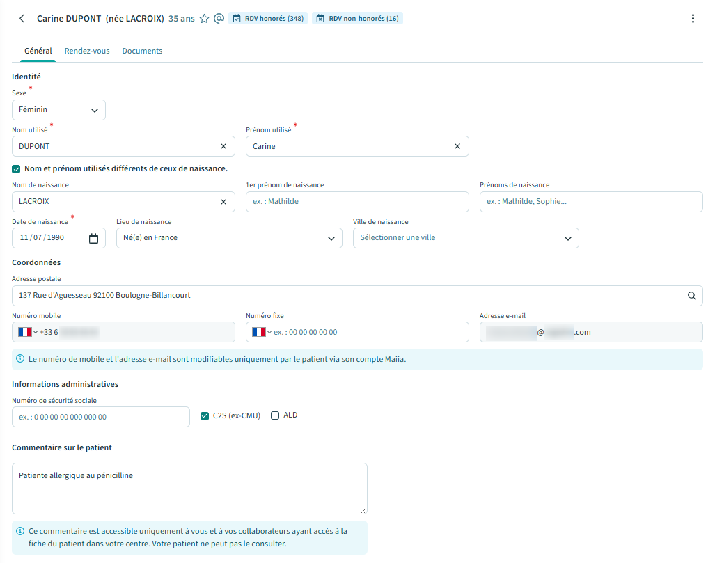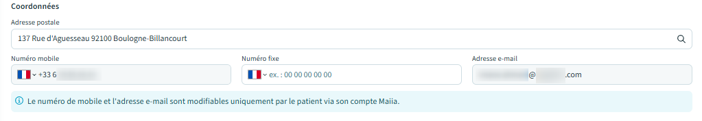 Attention : Lorsque le numéro du mobile et l'adresse mail du patient sont grisés, vous n'aurez pas la possibilité de les modifier car ces informations sont définis par le patient depuis son compte Maiia patient :