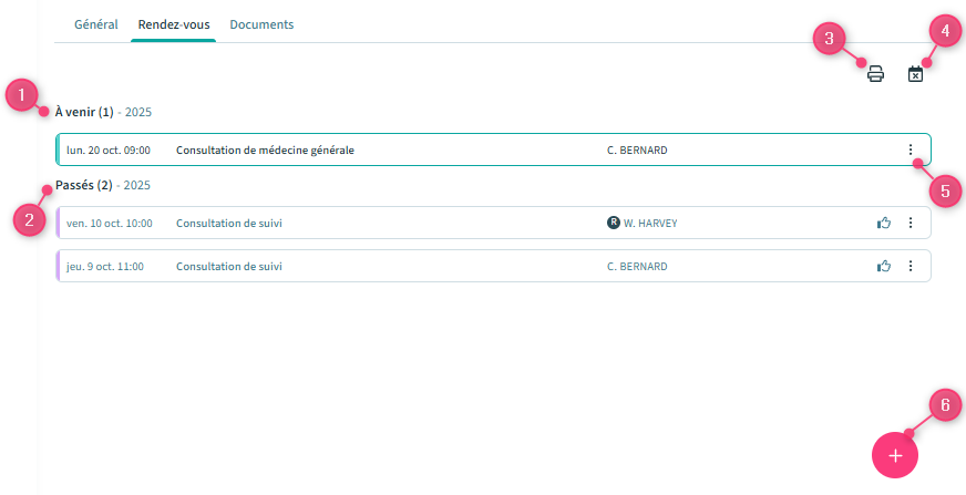 2. Onglet Rendez-vous : il vous permet de gérer les rendez-vous du patient en toute simplicité : consulter les rendez-vous passés et futurs, imprimer, annuler, alerter le patient d'un retard et prendre de nouveaux rendez-vous.