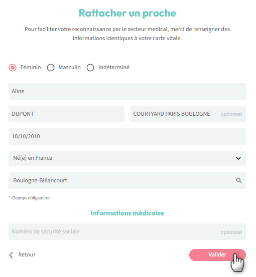 3. et remplir le formulaire correspondant aux informations du proche à créer, puis cliquer sur "Valider" :