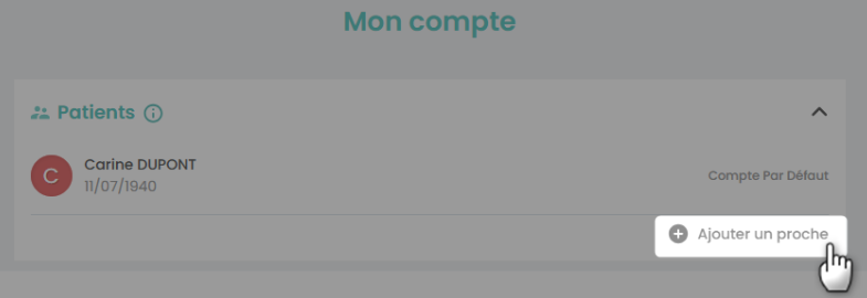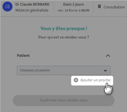 1. Le patient, responsable du proche, peut l'ajouter au moment de la prise de rendez-vous en cliquant sur "Ajouter un proche" :