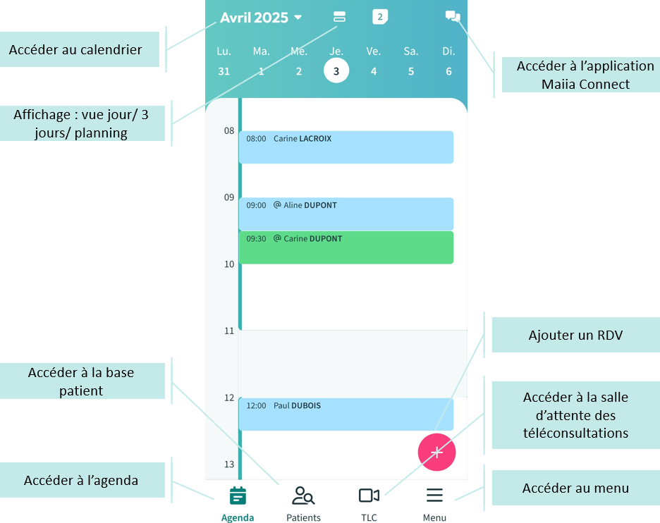 L'application Maiia Pro ouvre la page Agenda par défaut.