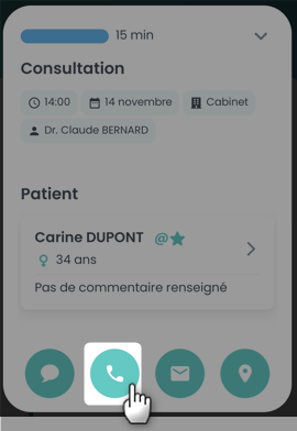 NB : les icônes sont actifs lorsque la fiche du patient contient toutes les informations nécessaires (un numéro de téléphone mobile, une adresse mail et une adresse postale).