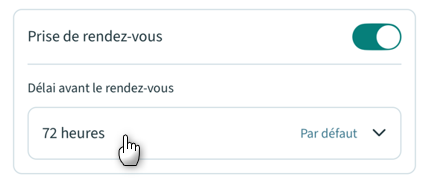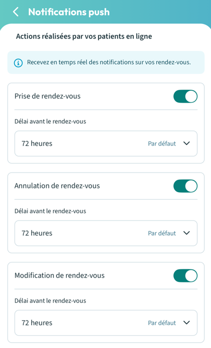 Pour choisir le délai pour lequel vous souhaitez recevoir les notifications push des actions effectuées par les patients sur les rendez-vous,