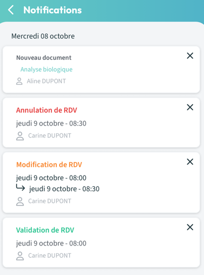 Le centre de notifications vous informe des actions réalisées par les patients sur les rendez-vous (Pose d'un nouveau rendez-vous, modification et annulation d'un rendez-vous posé) ainsi que sur les documents qu'ils vous envoient.