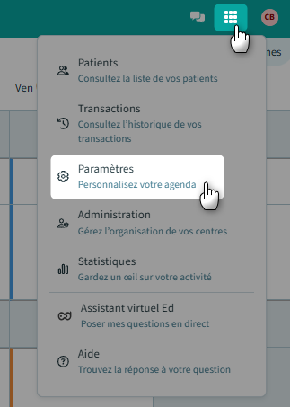 1. Depuis votre agenda, cliquez sur le menu en haut à droite puis sur paramètres :